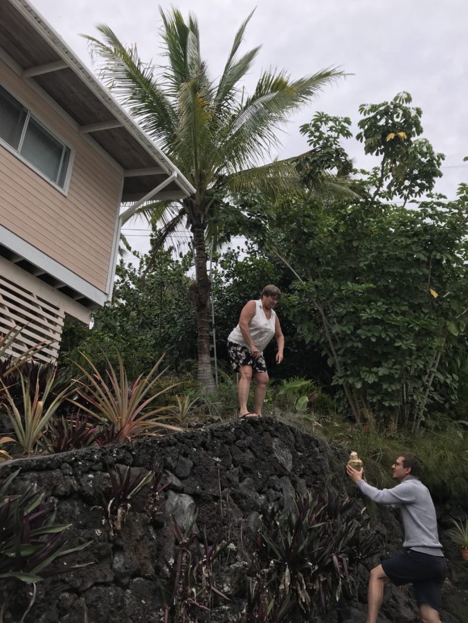 Nette Nachbarin schenkt Kokosnuss von Palme dahinter