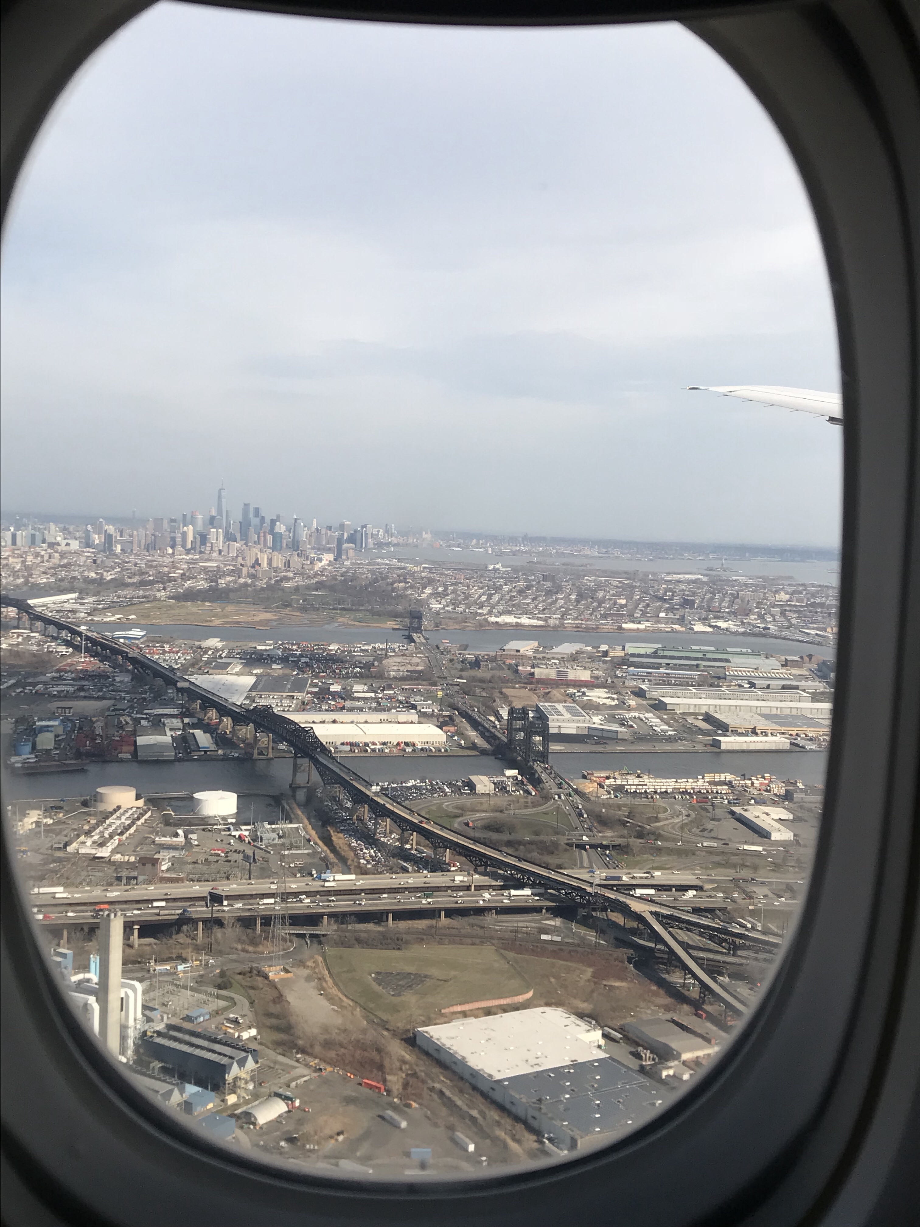 Manhattan Skyline und ganz klein die Freiheitsstatue
