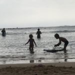 - Mit dem kleinen Brett (Skimboard) im Sand/Spülsaum gegen die Welle und dann mit dieser zurück auf den Sand – Skimboarding