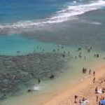 Hanauma Bay ist eine Bucht, die aus einem Vulkankrater entstanden ist. Dadurch, dass quasi nur an einer Stelle das Meer “reinschwappt”, ist sie von der rauen See abgeschirmt und mit ihrem Riff ideal fürs Schnorcheln. Zur abgelegenen Bucht gelangt man nur über eine Zufahrtstraße. Da tagtäglich tausende Touristen kommen und das Riff schon gelitten hat, bzw. noch leidet, wurde die tägliche Besucherzahl auf 2000 beschränkt, jeder muss ein Belehrungsvideo vorm Einlass anschauen und Dienstag ist immer “Ruhetag” (=Zufahrtsstraße gesperrt).
