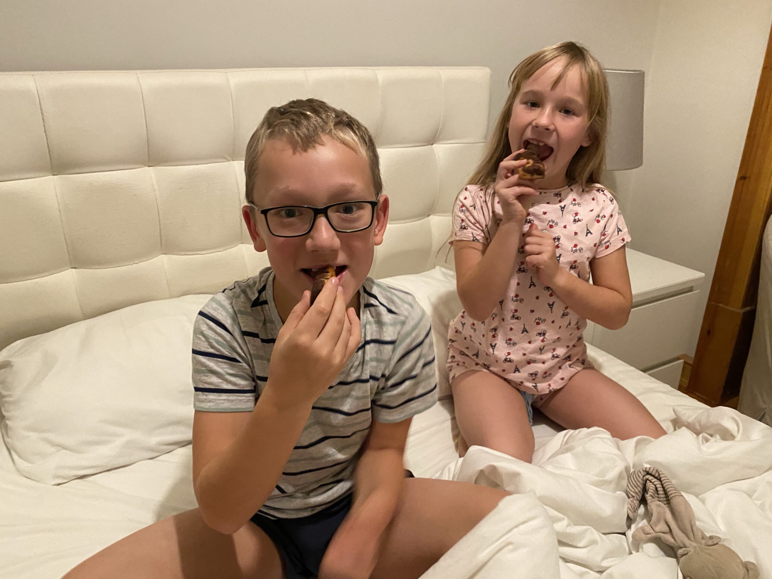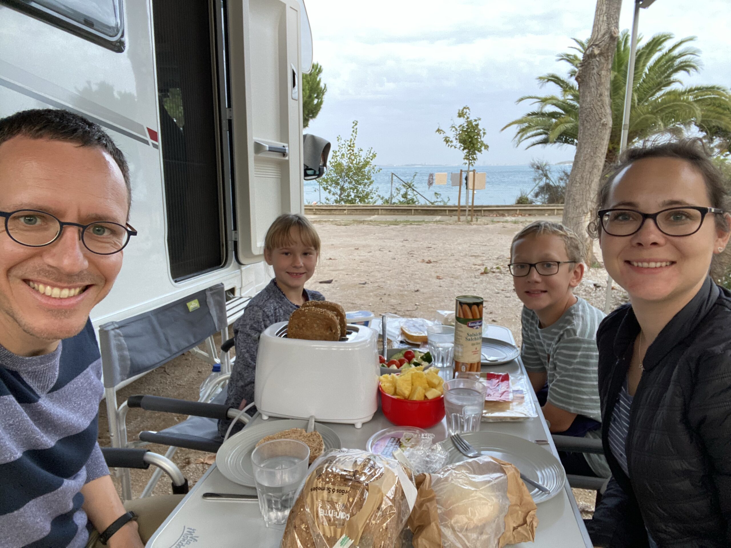 Den Campingplatz erreichten wir gegen 16 Uhr im Hellen, sodass wir es uns draußen gemütlich machen konnten und die Kinder noch ein bisschen Zeit zum Spielen auf dem Areal hatten. Zum Abendessen mit Meerblick kam dann gleich der neue Toaster zum Einsatz.