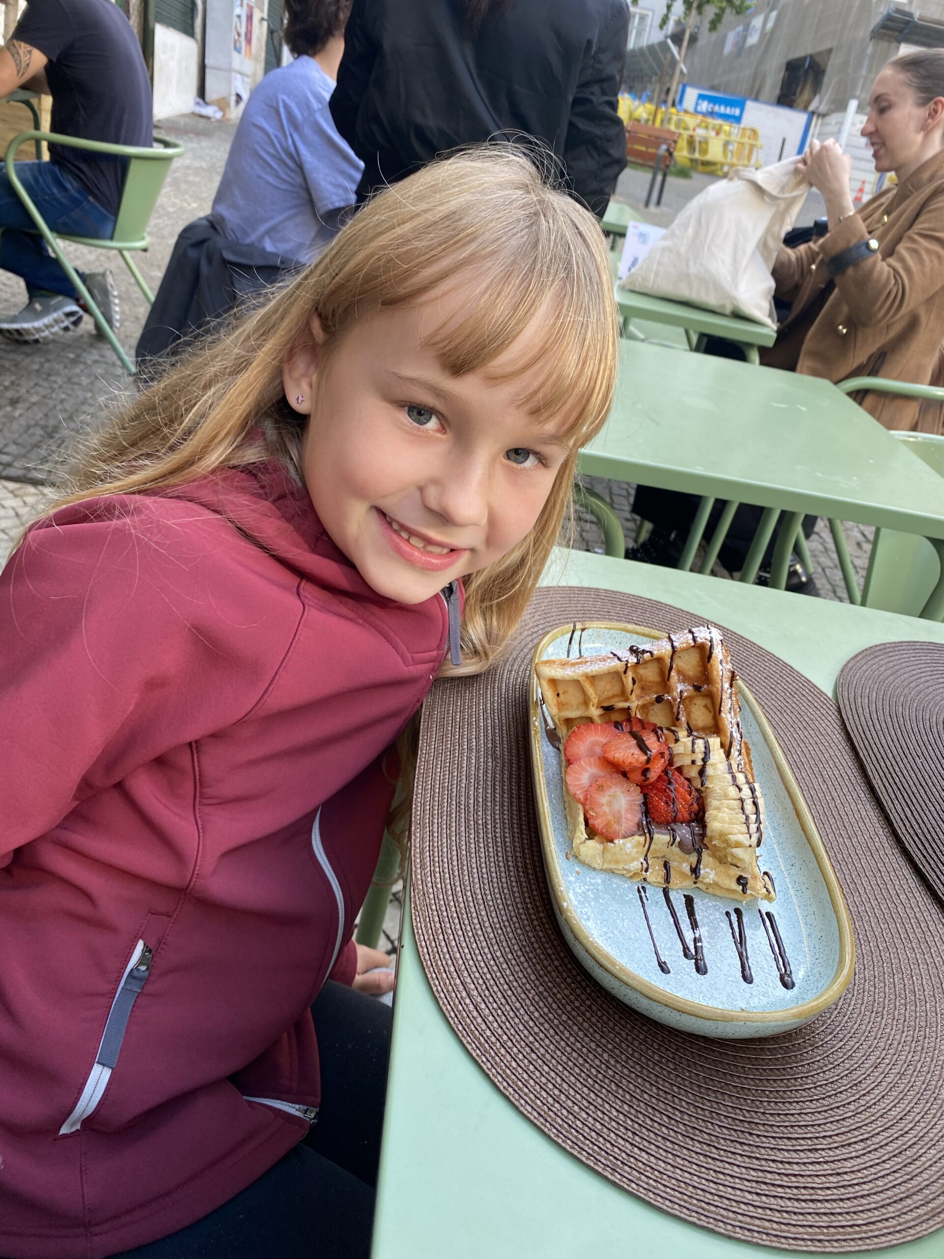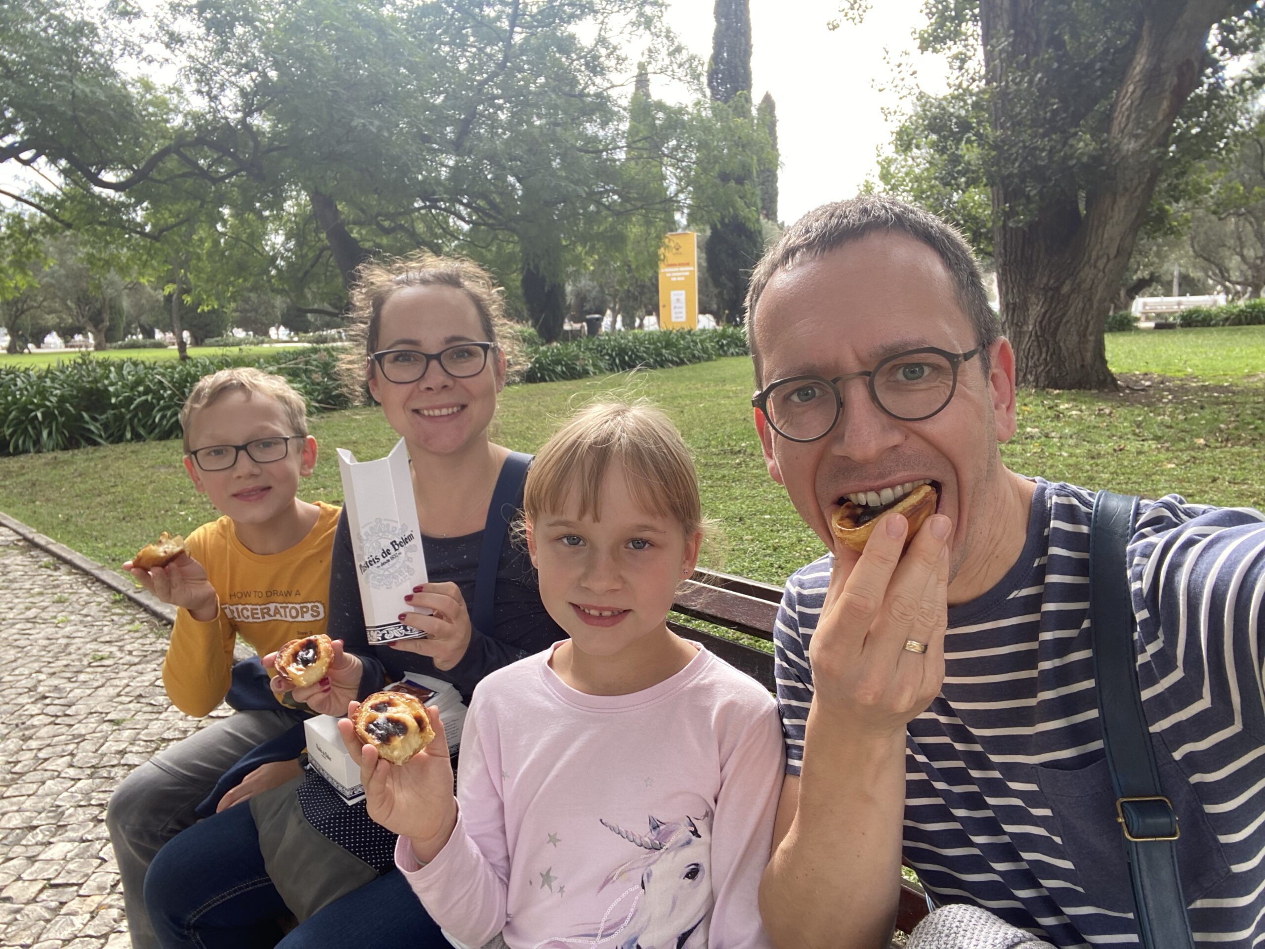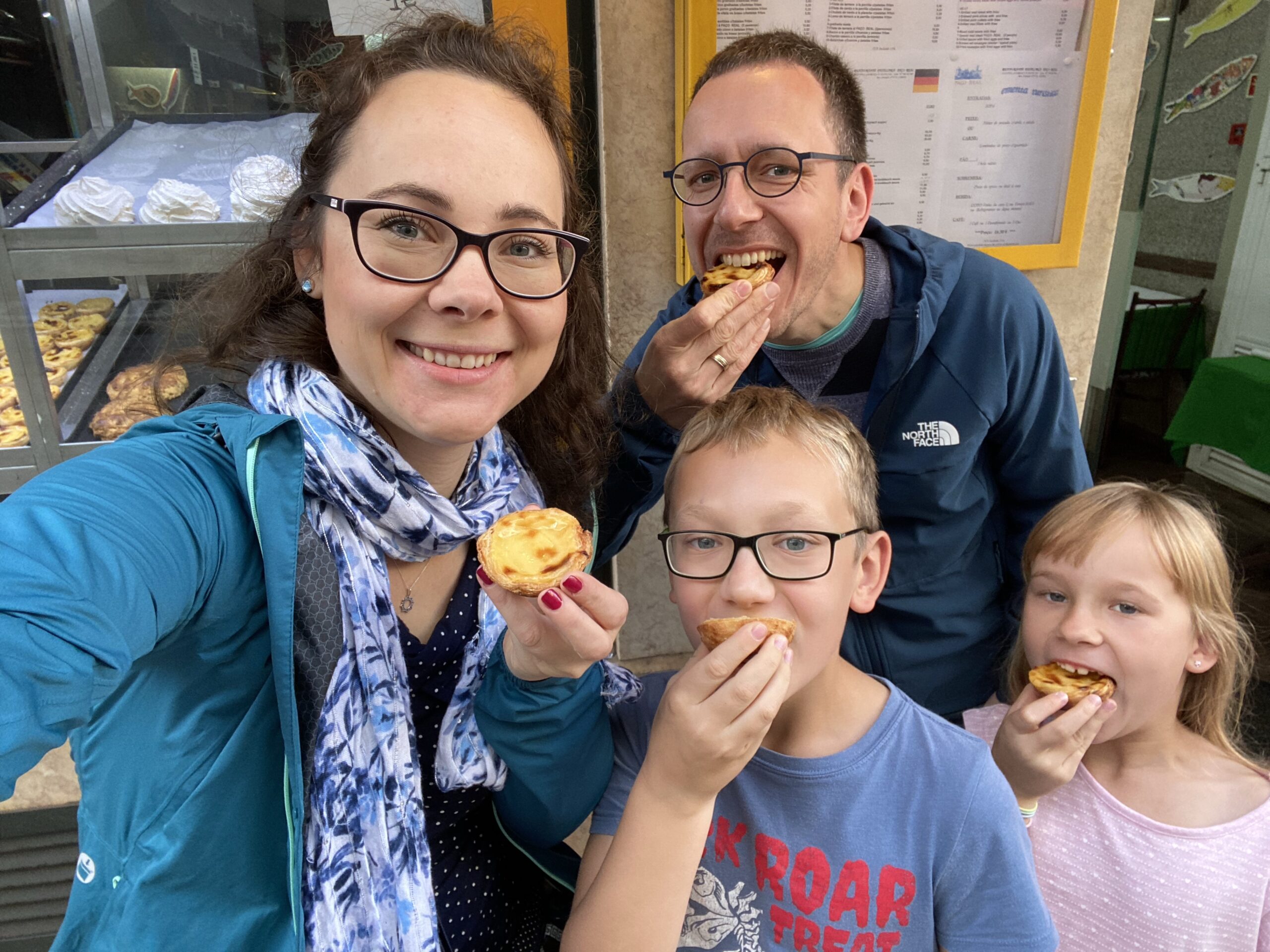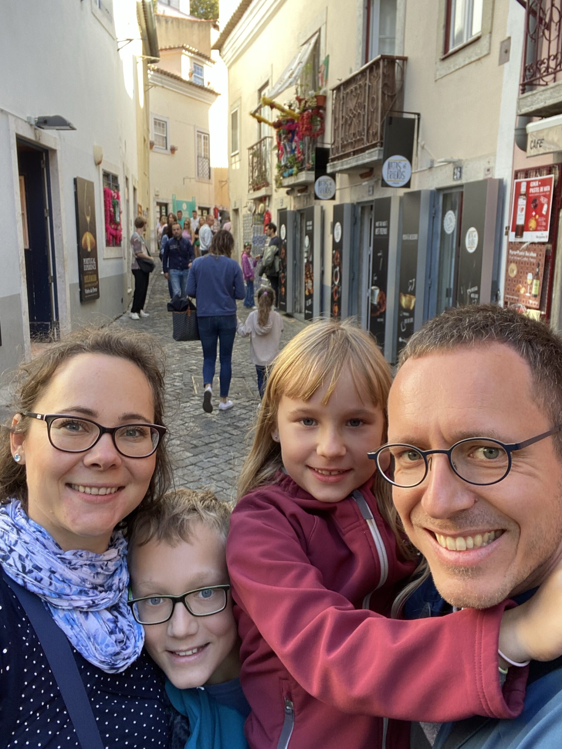 Da wir am Dienstag das Wohnmobil erst nachmittags in Empfang nehmen konnten, verbachten wir den Vormittag noch einmal in Lissabon. Nach einem leckeren Frühstück in einem Café um die Ecke ging es ein wenig shoppen. Unsere Spazierrunde führte uns noch zum Platz Praça Dom Pedro IV, den bisher nur Mathias bei Nacht gesehen hatte, bzw. wir alle vom Aussichtsturm. Weiter ging es in die historische Altstadt mit ihren engen, verwinkelten Gassen. Die Altstadt, in der unsere Ferienwohnung lag, war schon nicht mehr ganz so alt und deutlich strukturierter mit langen geraden Straßen. Nach einem etwas kleineren Mittagessen ging es dann mit dem Taxi zum Wohnmobilverleiher.