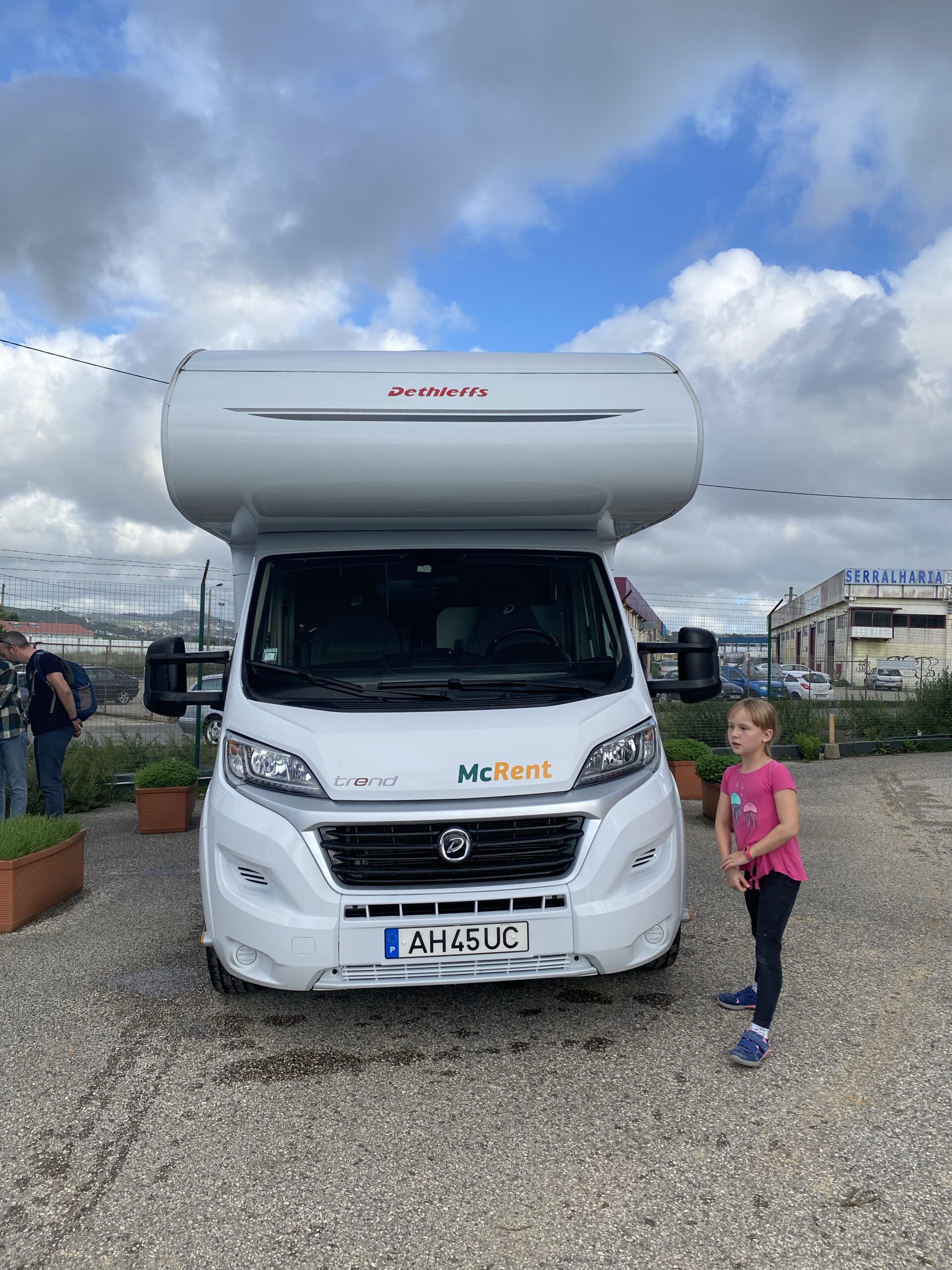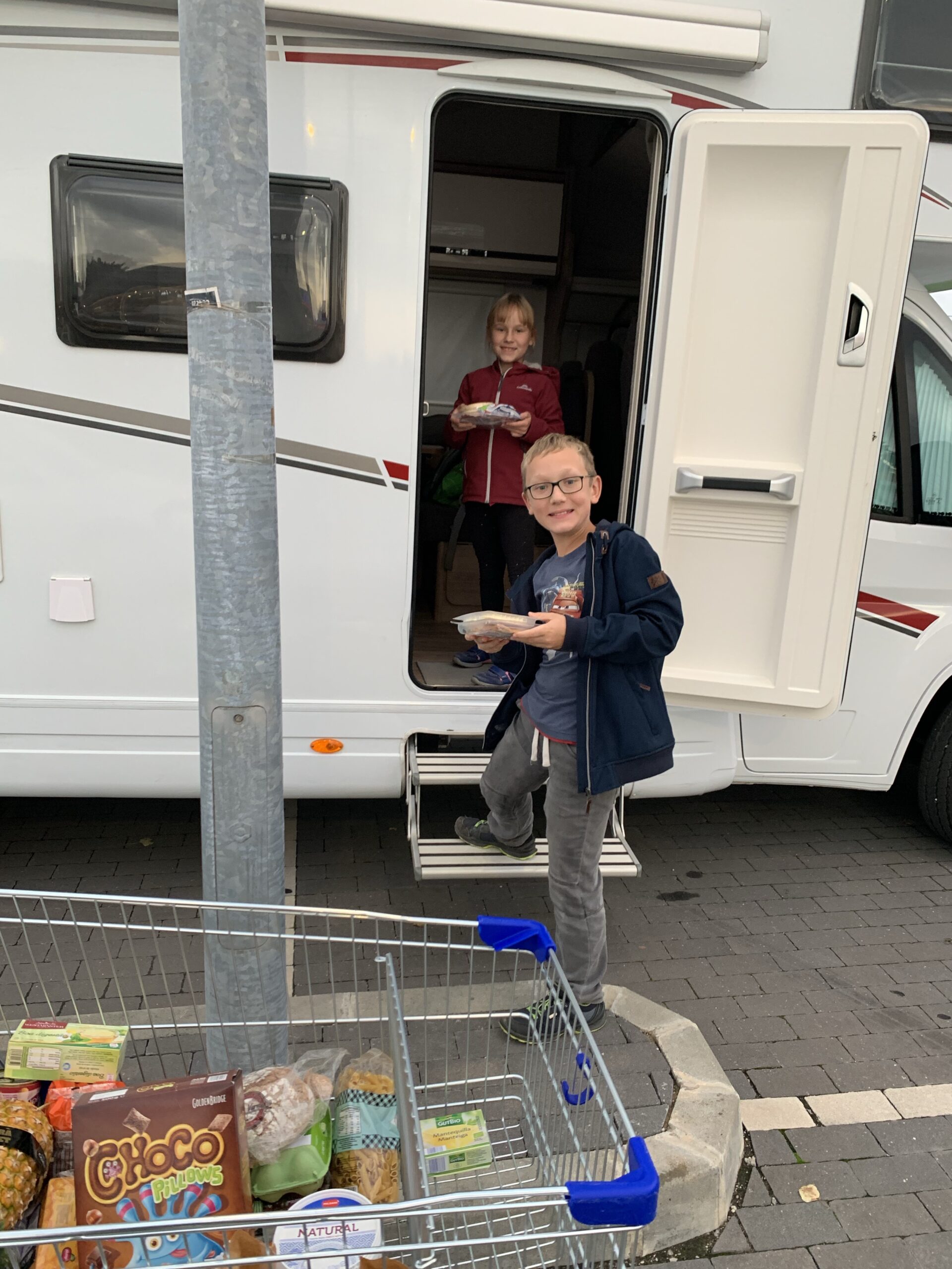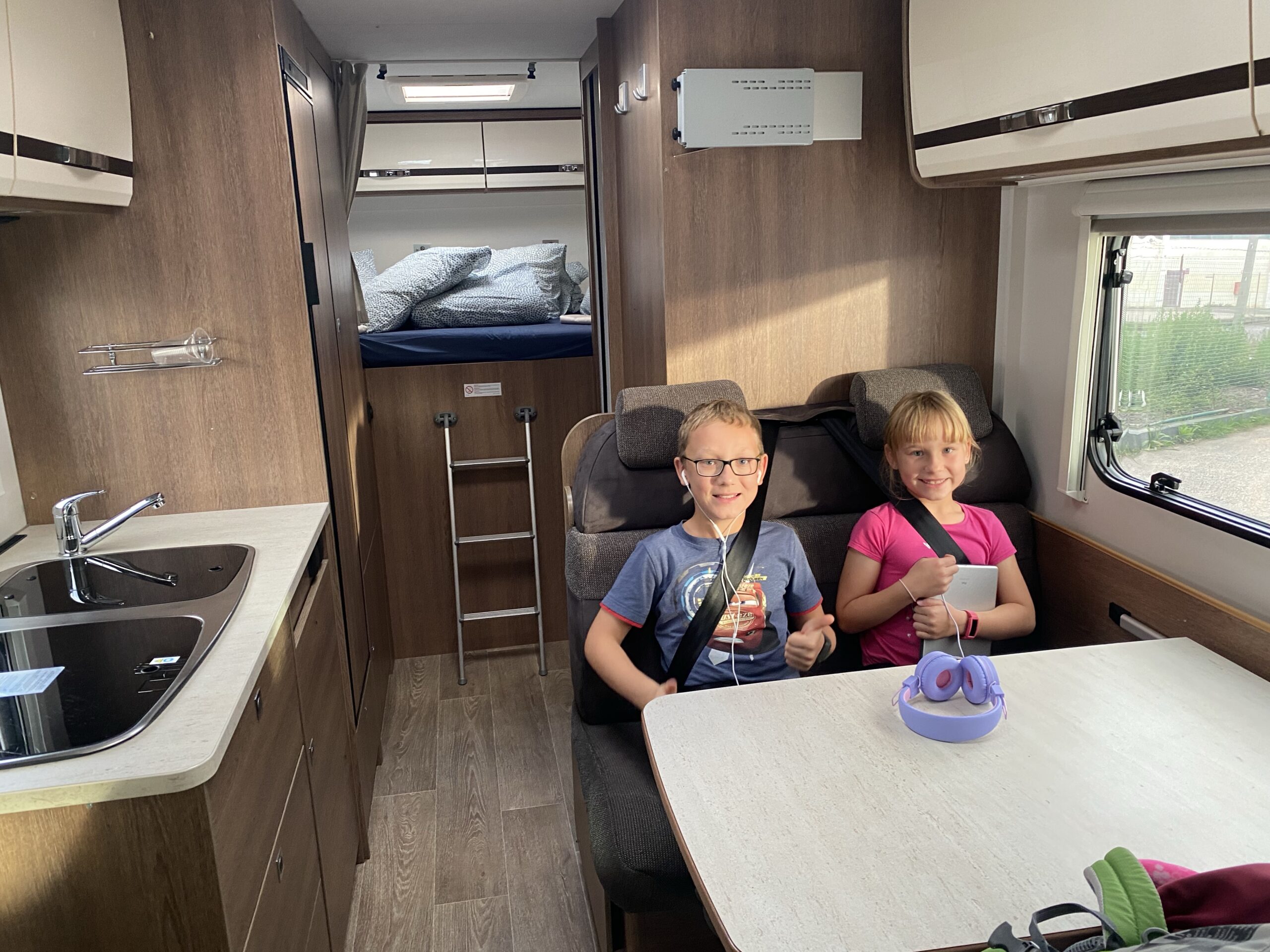 Das Abholen gestaltete sich mal wieder als etwas langwieriger – nach ca. 2,5h konnten wir endlich vom Hof fahren. Nun wohnen wir in einem 6-Bett-Wohnmobil. Die Kinder haben sich wieder den Alkoven ausgesucht und wir Eltern schlafen hinten. Somit bleibt der Esstisch immer frei für sonstige Aktivitäten.