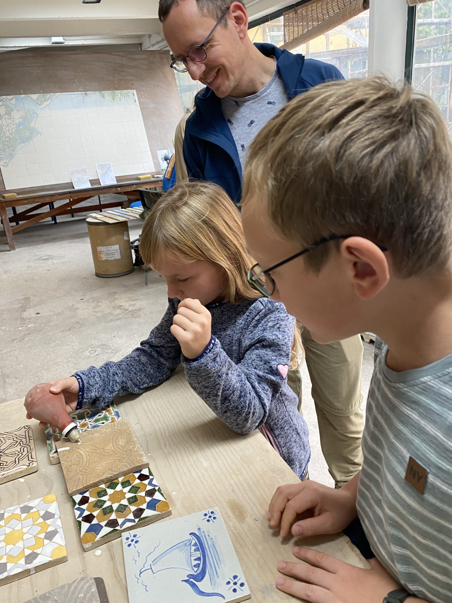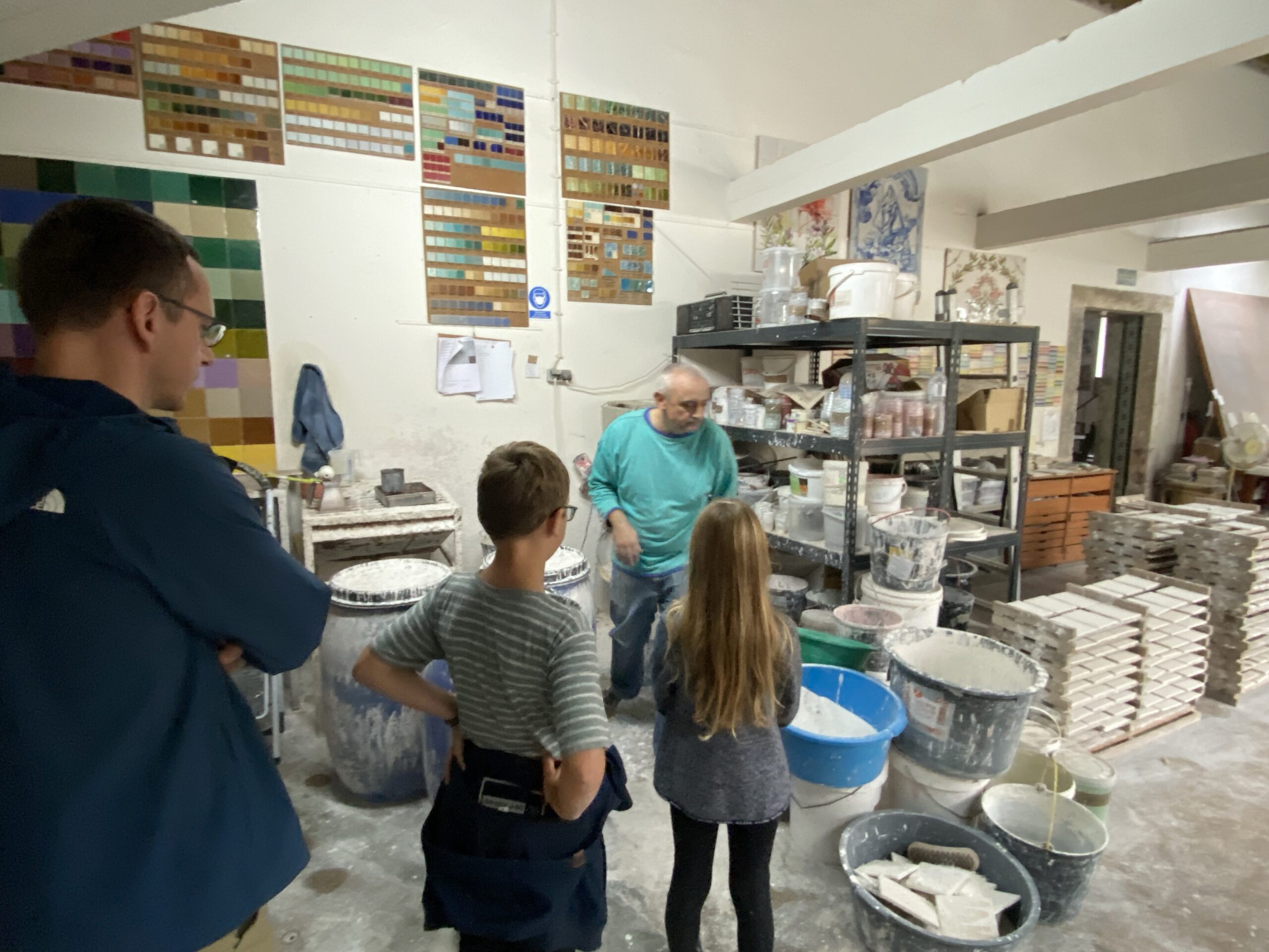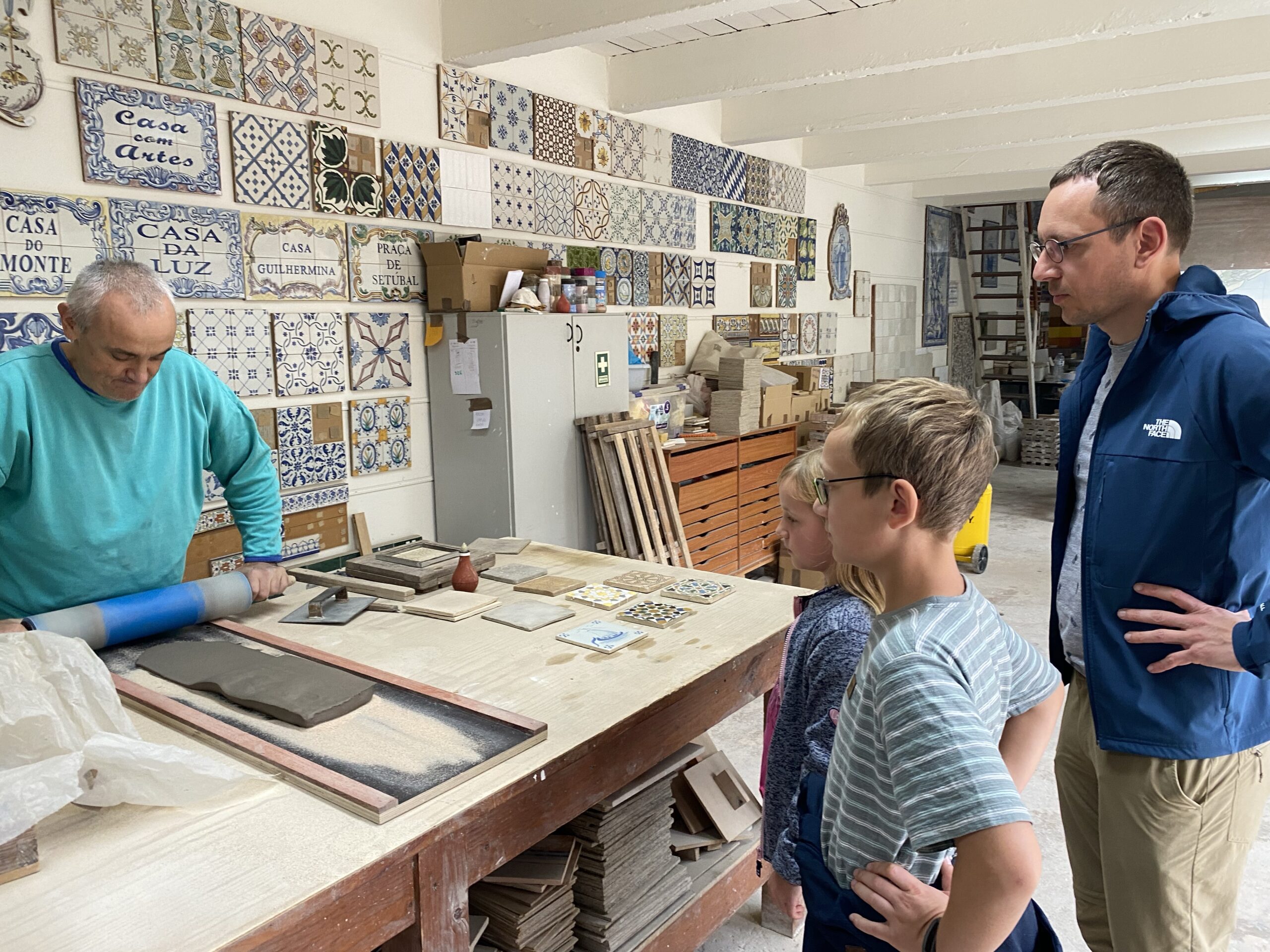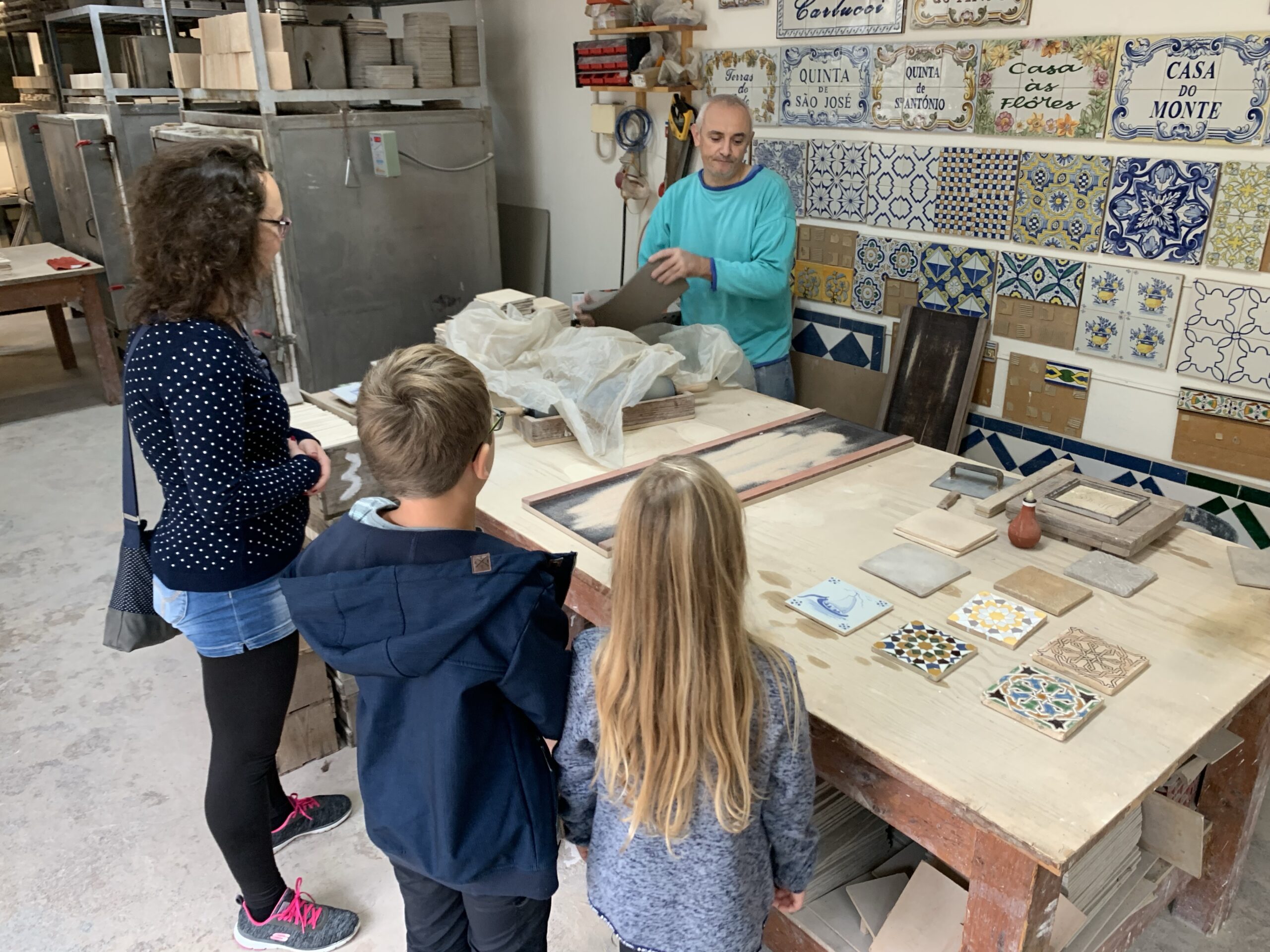 Unser erster Ausflug heute führte uns in eine nahegelegene Fliesenmanufaktur. Hier zeigte uns ein freundlichen Mitarbeiter, wie der Ton zunächst gerollt und dann die Fliese ausgeschnitten wird. Nach dem Trocknen und Brennen kann sie bemalt bzw. glasiert werden. Hier in Portugal nutzen sie dafür eine spezielle Glasur, die auch feine Malereien ermöglicht, ohne dass die Farbe beim Brennen zerläuft.