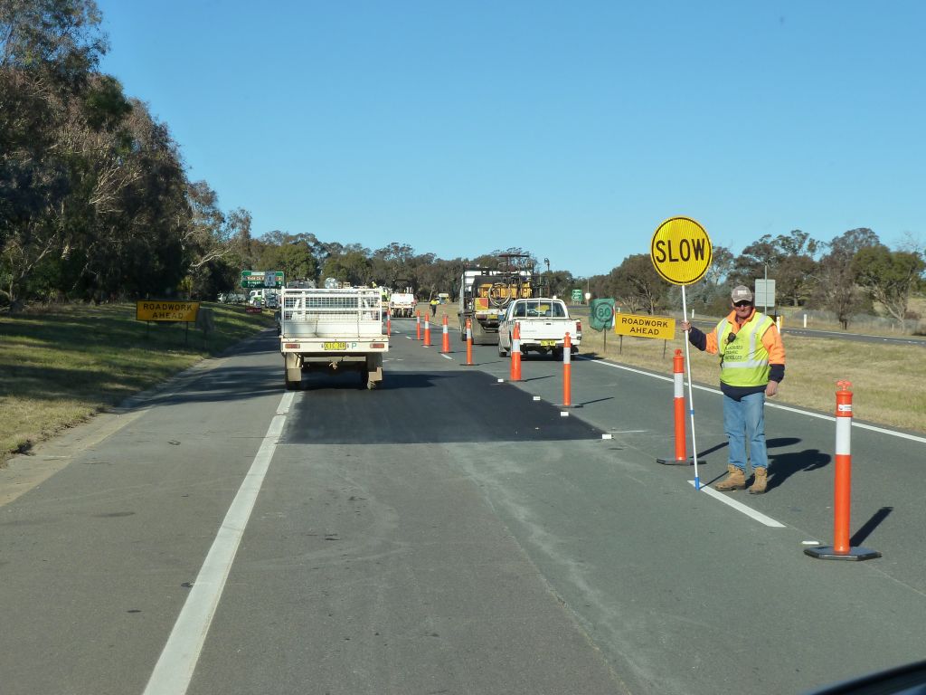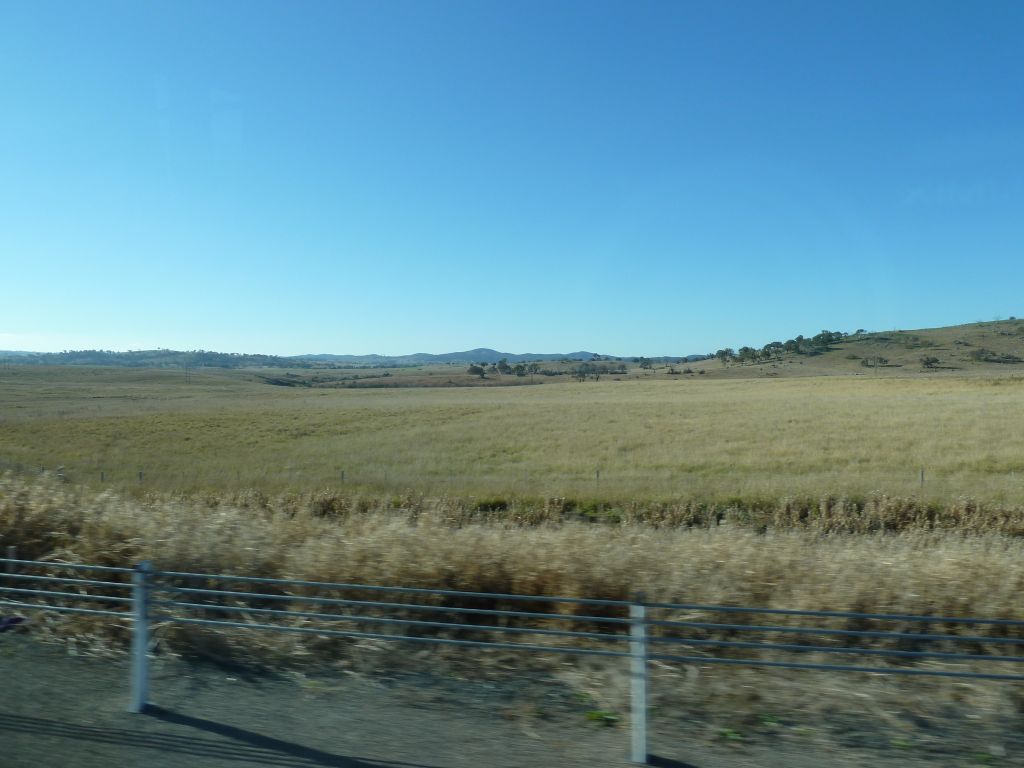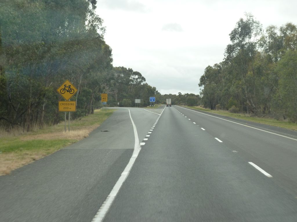 Die Fahrt auf dem Freeway, der australischen Autobahn ist auch ein bisschen anders als bei uns. Da hier jeder Farmer seine eigene Autobahnzufahrt benötigt (Die Farmen sind groooß), lohnt es bei der geringen Nutzung nicht, jedes Mal eine Brücke oder einen Tunnel zu bauen, also biegt man einfach rechts ab, passiert vorsichtig die entgegenkommenden beiden Spuren und ist schon zu Hause. Große Städte, wie das oben erwähnte Gundagai, haben für die Touristen natürlich eine ordentliche Auf- und Abfahrt. Spannend ist die Fahrt ansonsten nicht auf dem Freeway, immer durch die Steppe durch, mal etwas hoch, mal etwas runter und nie mehr als 110km/h. Dafür dürfen alle so schnell fahren: die Autos, Wohnmobile, Wohnwagen und längeren und höheren LKWs – aber auch die Fahrradfahrer. Vermutlich mangels alternativer Wege dürfen diese auch auf dem Standstreifen der Autobahnen fahren. Und wo der Freeway noch nicht um einen Ort herumläuft, verengt er sich kurz auf eine Spur je Richtung und läuft geradewegs durch den Ort durch als Landstraße, um danach wieder kräftig in die Breite zu gehen, denn Platz hat man ja hier im Niemandsland.