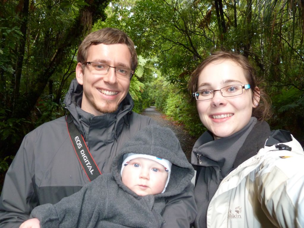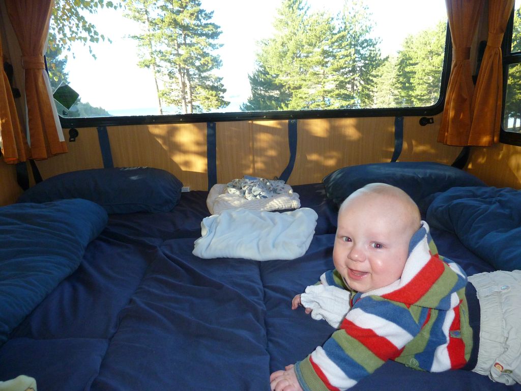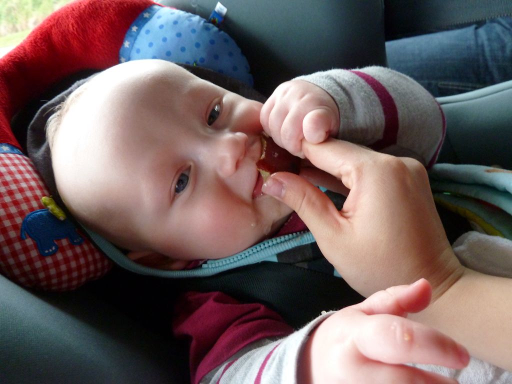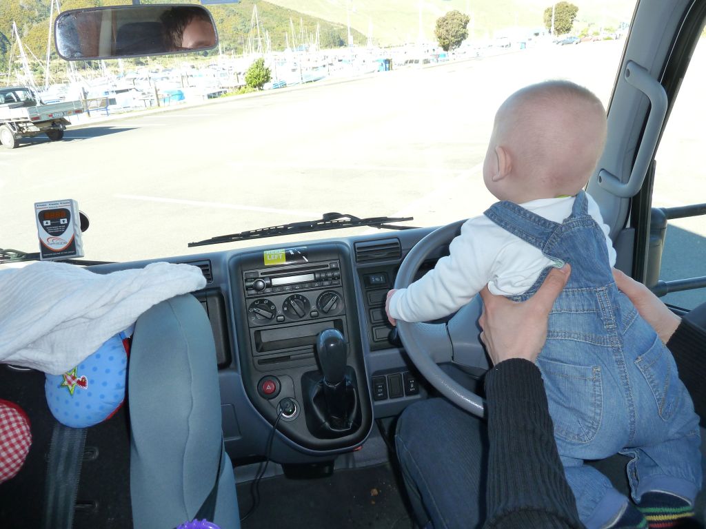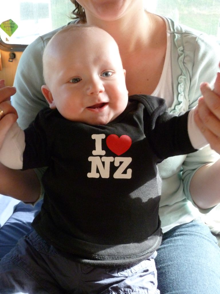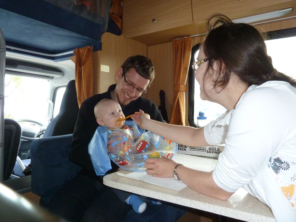Für mich beginnt der Tag im Land der Träume. Dann wache ich manchmal auf, wenn es noch dunkel ist und erzähle Mama und Papa von meinem Traum. Aber die schlafen einfach weiter – ihr gleichmäßiges atmen lässt auch mich dann immer ganz schnell wieder einschlafen. Aber spätestens wenn es langsam hell draußen wird ist Schluss mit Schlafen! Wenn ich dann den Vorhang hin und her schiebe, sehen das auch bald Mama und Papa ein und kuscheln und spielen mit mir. Mama steht dann bald auf und holt mir eine neue Windel – vor kurzem gab’s endlich wieder Pampers zu kaufen, die lokalen Huggies sind ganz schön dick und unbequem. Leider hat Mama immernoch keine Kleidung gekauft, die nicht über den Kopf zu ziehen ist – ich erinnere sie doch jeden Tag daran! Nach so viel rumtollen brauche ich meist nur noch ein bisschen zu trinken und dann ist es Zeit für das Nach-Dem-Aufstehen-Schläfchen. In der Zeit können dann auch Mama und Papa in Ruhe Frühstückessen oder losfahren, wenn es mal wieder etwas später mit dem Nickerchen wird. Ganz oft fahren wir gar nicht weit und dann steht eine Wanderung an. Dann packt mich Mama immer viel zu dick ein und schnallt mich beim Papa auf den Bauch (letztens sogar mal bei sich selbst). Das ist zwar immer ganz schön eng, aber eigentlich gar nicht so schlecht. Ich kann dann schön die Bäume beobachten und Papas Herzschlag hören. Der wird immer ganz schön schnell, wenn es den Berg hochgeht. Dann schlaf ich immer lieber schnell ein, damit Papa nicht mitbekommt, dass ich es bin, der hier so schwer an ihm hängt 😉 Doch Mama und Papa wandern gern länger als mein kurzes Nickerchen, sodass ich bald wieder die Welt um uns herum beobachten kann. Wird dies langweilig, brauch ich mich nur kurz beschweren und schon singen die beiden ein Lied nach dem anderen. Ach toll! Zurück zu Hause spricht Papa immer von „seinem kleinen Backofen“. Ich weiß gar nicht was er hat, wenn hier einer ganz warm ist, dann er! Nach so einer anstrengenden Wanderung knurrt mir immer ganz schön der Magen, gut das Mama ganz viele Sorten Breichen gekauft hat. Da gibt es immer mal was Neues – das ist auch gut so, denn meistens schmecken die nicht so gut 🙁 Den mit Rind und den mit Reis mag ich am liebsten – da darf mir Papa auch schon mal ein 3/4 Gläschen warm machen. Anschließend darf ich dann wieder hinten ein bisschen die Welt der Bewegung erkunden, während es großes Mittagessen gibt. Wenn es dann mit unserem Zuhause weitergeht, bin ich voll dabei. Ich darf vorne bei Mama und Papa mit sitzen und zeige Mama immer auf der Karte wo es hingeht. Leider hört Mama nicht immer auf mich, sodass Papa hin und wieder umdrehen muss. Wenn es gerade nichts zu lesen gibt, hat die Mama ganz viel Spielzeug für mich parat. Am liebsten mag ich die Spiegel – entweder um das andere Baby zu bestaunen oder die Sonnenreflexion am Dach zu verfolgen. Was so ein Spiegel alles Tolles kann! Wenn wir mal wieder länger unterwegs sind hat die Mama Obst da. Da darf ich dann auch immer mal dran rumlecken. Apfel ist mir ja viel zu sauer, aber Birne ist gar nicht schlecht und Weintrauben total lecker süß. Da kann ich dann auch endlich mal meine Zähnchen einsetzen. Seit neustem erzählen ja Mama und Papa was von oberen Zähnen – wozu auch immer man die noch gebrauchen kann. Spüren kann ich jedenfalls noch nichts. Nur lustig knirschen tut’s, wenn ich die Lippen zusammenpresse – und wie lustig die Mama dann immer dreinschaut! 😉