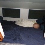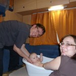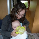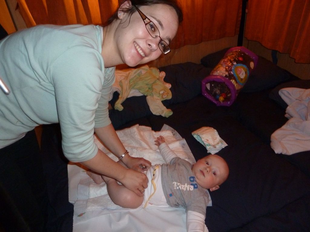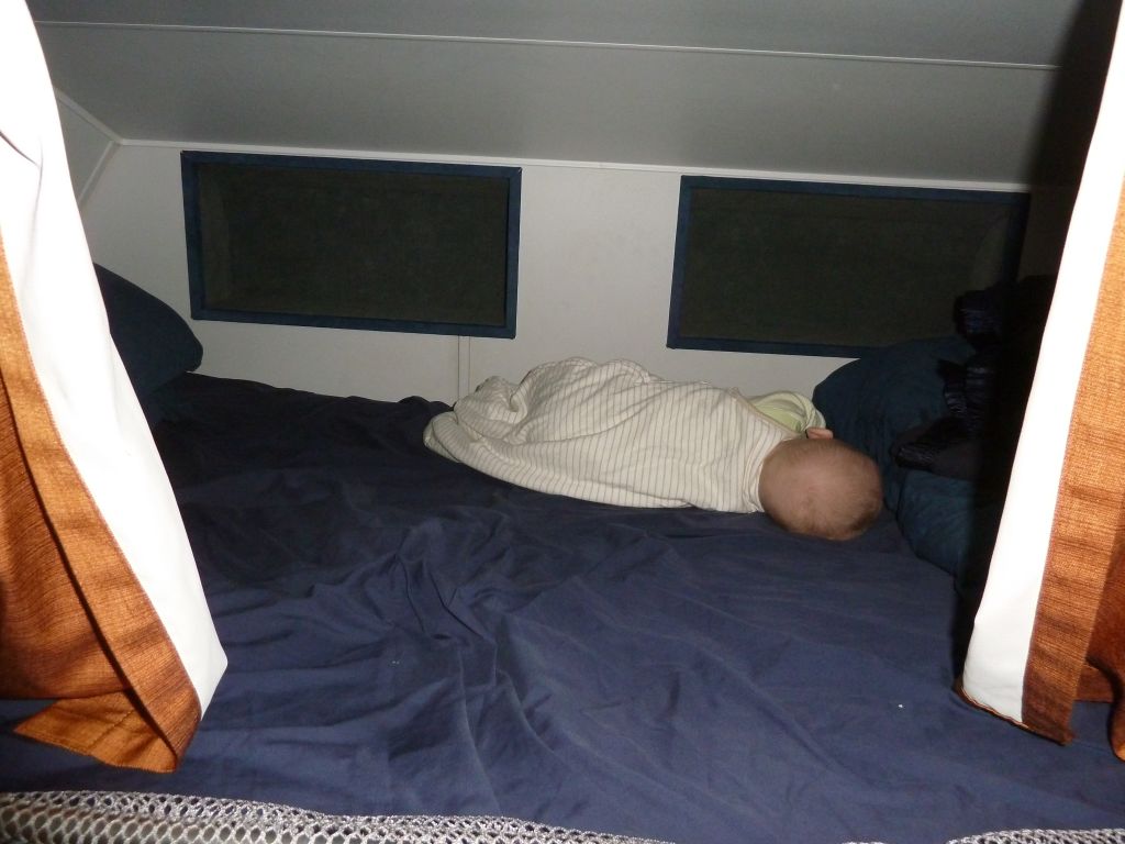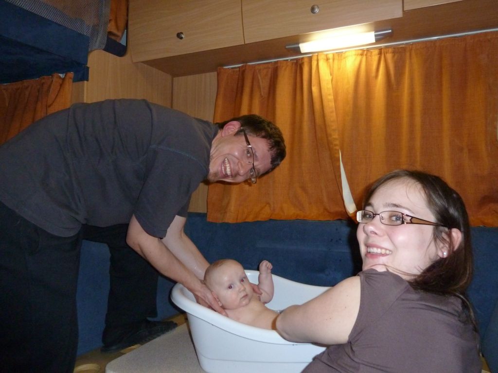 Doch leider ist solch ein Tag ganz schön anstrengend. Seit neustem gibt es vor dem Schlafen gehen einen anderen Brei. Der schmeckt süßer als der Mittagsbrei, also werde ich mal fleißig den Mund öffnen, damit diese neue Quelle nicht wieder versiegt. Danach rubbelt Papa noch mit irgendwas in meinem Mund rum und singt ein Lied vom Zähne putzen. Naja, hauptsache etwas im Mund, worauf man beißen kann! Und wenn mir Mama dann die Windel abgenommen hat, kommen auch meine Füße noch zu ihrem wohlverdienten Spielspaß. Wozu man diese Füße wohl noch so nutzen kann? Ich werde mal ein bisschen rumprobieren – ob ich sie mal in den Mund nehmen soll? Hin-und-wieder steht dann noch ein Bad an. Naja, eher eine Dusche bei uns zu Hause bei Papa auf dem Schoß. Mama passt dann schon nicht mehr ins Bad und sprüht mich von draußen ab. Nur letztens durfte ich richtig baden. Doch Papa hat so wenig Wasser eingelassen, dass ich gar nicht richtig plantschen konnte… Sobald ich also fertig geduscht oder wenigstens gewaschen wurde, holt Mama dann meinen Schlafanzug auf dem Schrank und steckt mich in einen riesengroßen Sack. Da bekommt Papa immer Angst, dass die Mama den Reißverschluss mal zu hoch macht und ich darin verschwinde 😉 Je nachdem, wo wir gerade sind, wollen die Mama und der Papa Strom und Wärme sparen oder nicht. Wenn wir von allem reichlich haben, schlafe ich erst mal in alle Ruhe im Alkoven vor. Da bin ich vor Licht und Wärme gut geschützt. Wenn jedoch das Licht erlischt, darf ich bei Mama und Papa mit ins Bettchen. Mama hat wohl bedenken, dass sie mich in der Dunkelheit hier oben im Alkoven nicht wiederfindet… Wenn Stromsparen angesagt ist, darf ich gleich bei Mama und Papa im Bettchen einschlafen – da ist es dann auch dunkel und kühl, weil der Heizlüfter und das große Licht nicht funktionieren.