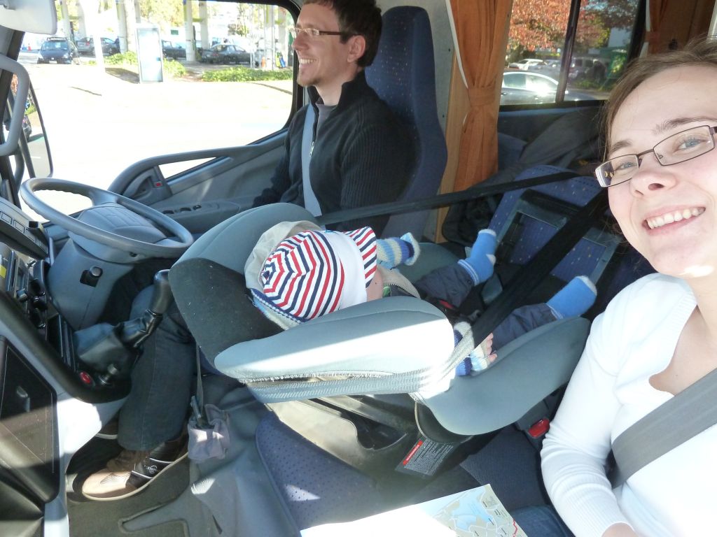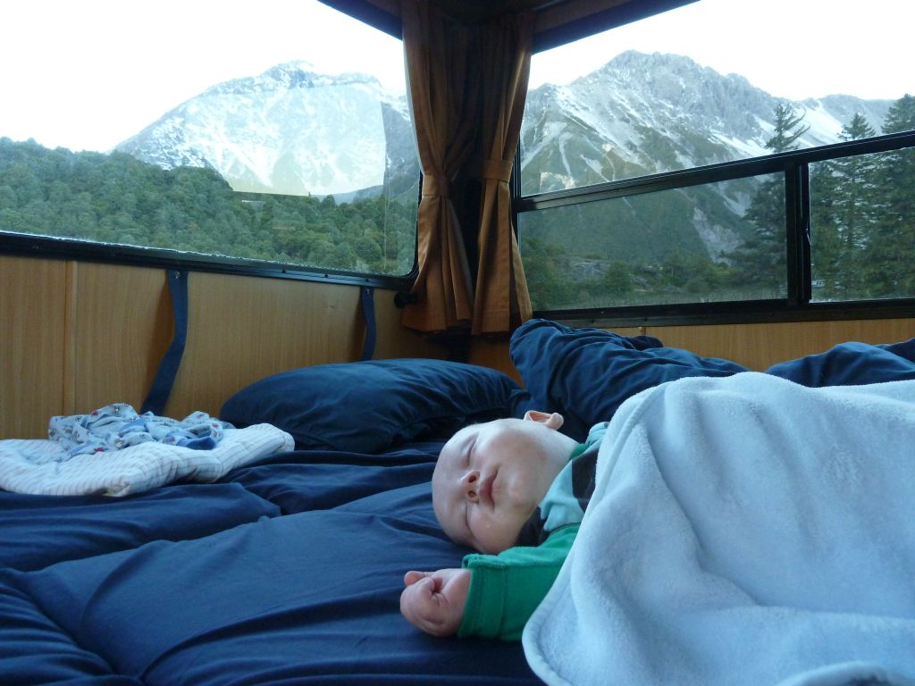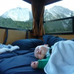 Da Florian sich jetzt wie gesagt auch an die Zeitumstellung gewöhnt hat, beginnt unser Tag zwischen 6 bis 7 Uhr damit, dass er zwischen uns liegend anfängt zu quatschen. Dann ziehen wir die Vorhänge um unserer Liegewiese auf und schauen wie die Sonne aufgeht. Ob nun mit Blick auf einen See oder wie letzte Nacht auf die südlichen schneebedeckten Alpen. Während Denise Flori fertig macht, bereitet Mathias das Frühstück vor. Dafür wird zuerst Wasser für unsere Tees gekocht – entweder wird dafür erst der Gashahn aufgedreht (wenn wir nicht auf einem Platz mit Strom stehen) oder einfach der Wasserkocher angemacht. Zum Frühstück gibt’s Kornflakes mit Milch oder Weißbrot (in allen Variationen) mit Belag. Während Florian dann auch „abgefrühstückt“ wird, wäscht der Papa ab. Beim Abwaschen und Zähneputzen versuchen wir so wenig Wasser wie möglich zu verbrauchen, da wir ja nur einen begrenzten Tank haben. Auch unsere Toilette „darf“ nur zum Pipi machen benutzt werden, da wir sie ja selbst leeren müssen 😉 Zum Schluss wird wieder alles an seinen geordneten Platz verstaut, damit beim Fahren nichts umherfliegt. Wenn wir an einem Campingplatz sind, folgt noch Wasser auffüllen und Abwasser ablassen. Wenn wir gut sind ist es dann 9Uhr. In den letzten 2 Tagen waren wir dann vormittags 2-3Stunden wandern und sind nachmittags nach einem kleinen Mittag & Florians Brei weiter gefahren. Die Babybrei Auswahl ist hier übrigens recht begrenzt und besteht aus Gemüsemixen wie z.B. Karotte, Kürbis und Süßkartoffel. Flori schlägt zwar nicht so zu wie bei den deutschen Breien aber ein halbes Gläschen schafft er immer.