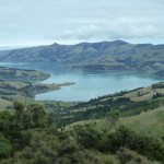 TourismRadio. Das ist ein kleines Gerät von der Vermietung, dass ganz viel Autofahrmusik drauf hat und alle paar km etwas über die Gegend erzählt (per GPS-Ortung). Der Weg nach Akaroa verlief über eine Hügelkette, von der aus man wunderschöne Ausblicke auf das türkisfarbene Wasser der Bucht von Akaroa hatte. Wir staunten auch nicht schlecht als plötzlich eine Herde Kühe mitten auf der Strasse auftauchte und von einem Ranger im Auto den Berg hinunter (und um uns herum) getrieben wurde.