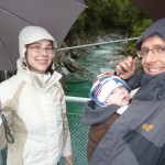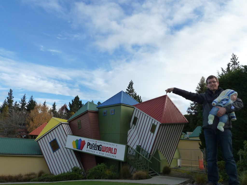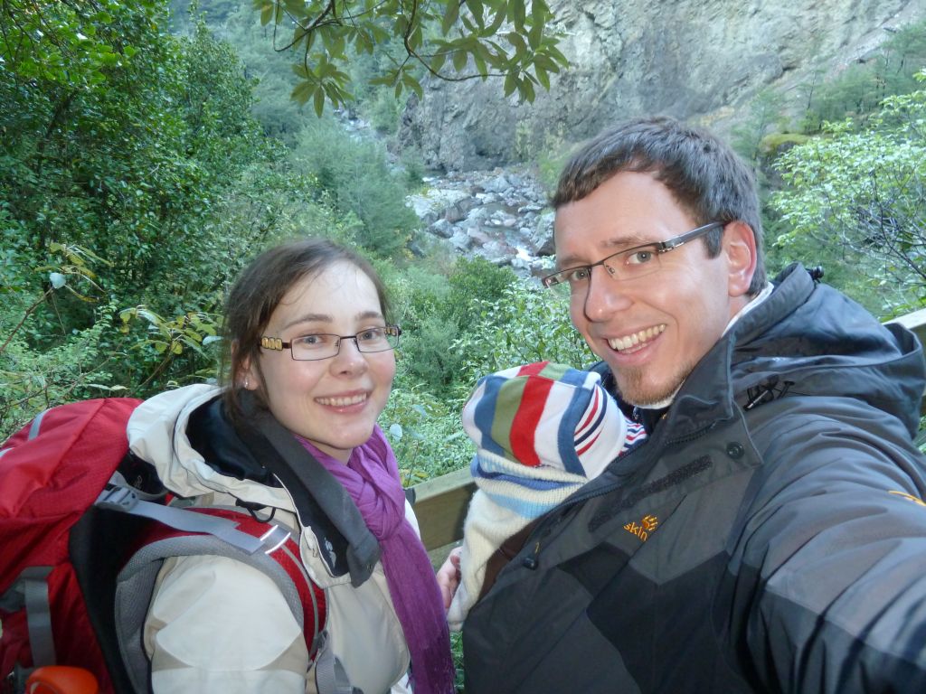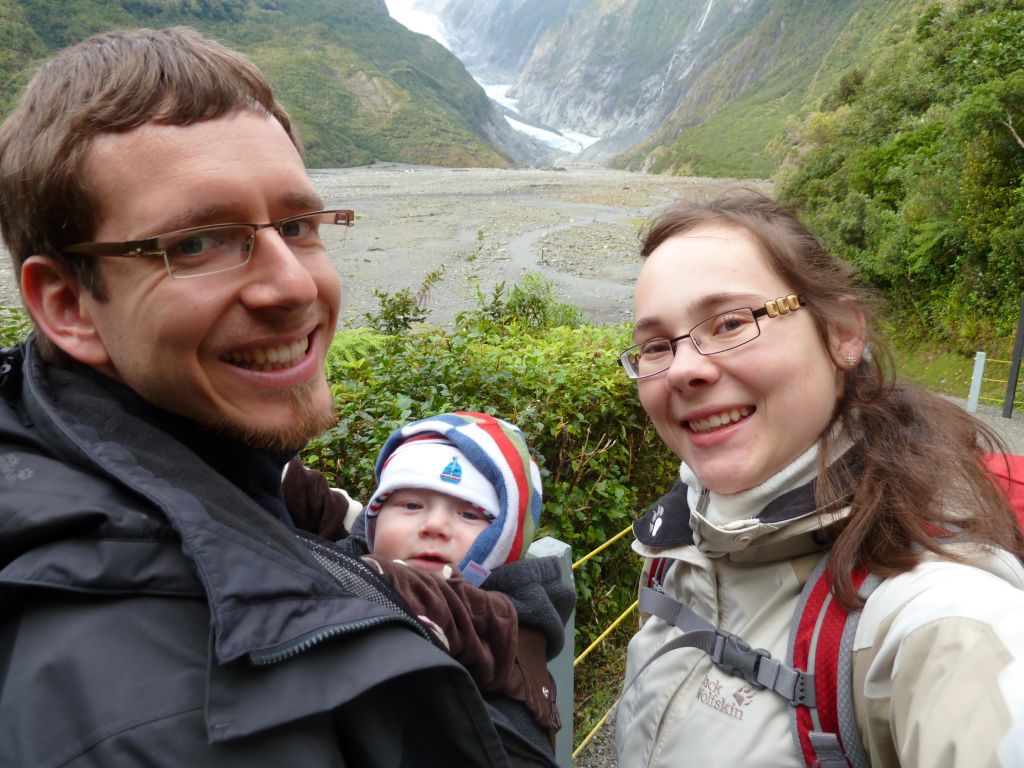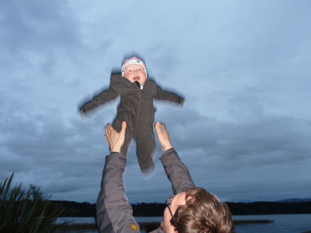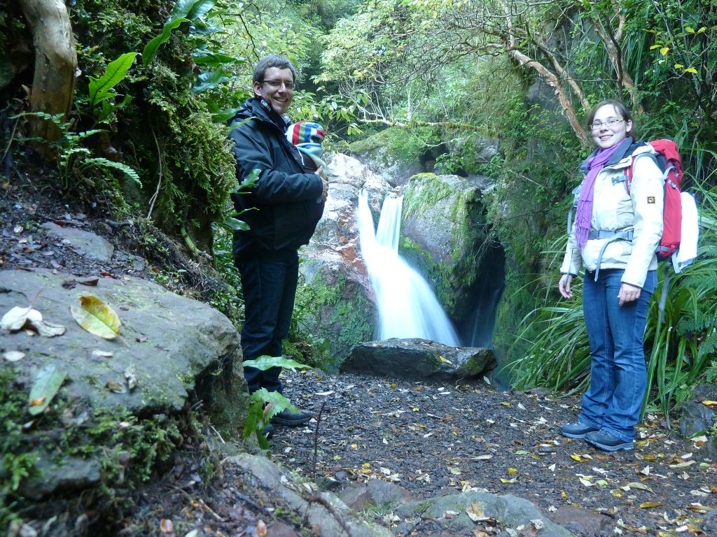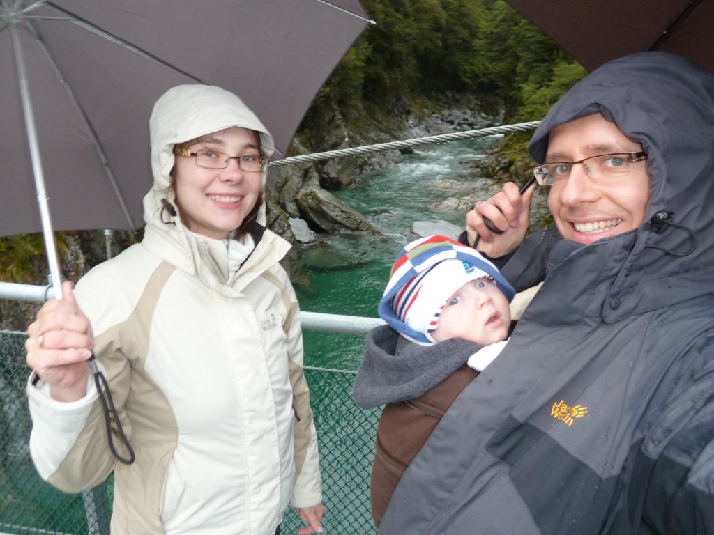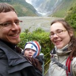 Von TeAnau sind wir dann am Donnerstag Richtung Wanaka gefahren. Dort waren wir in der Puzzling World – in verschiedenen „Illusion Rooms“ konnten wir unserer Wahrnehmung nicht trauen. War sehr lustig. Da es aber sonst – wie immer – nichts soo spannendes in Wanaka gab, sind wir gleich weitergefahren. Wir haben wieder einen Campingplatz in einem Naturreservoir angepeilt und standen pünktlich zum Sonnenuntergang an einem malerischen See… Allerdings komplett einsam und abgeschieden ohne Handyempfang (!). Der Mama war das dann wieder nichts und so haben wir 10km weiter auf einem Hof mit Stellplätzen übernachtet – zwar auch als einzige Camper aber wenigstens waren noch die Besitzer da. Irgendwie ist diese unendliche menschenleere Natur wunderschön und beängstigend zugleich – naja so sind wir, wir Stadtmenschen. Am nächsten Tag ging es dann über den Haast Pass an die Westküste ans Meer. Leider hat es geregnet – das ist wohl typisch für die Westküste. Trotzdem sind wir auf dem Weg dorthin, noch zu den „Blue Pools“ und 2 Wasserfällen gewandert. Auch Haast ist ein kleines verschlafenes Nest, indem es im kleinen Laden nicht mal Brot gab. Dafür haben wir gleich bei unserem ersten Abstecher ans Meer Delfine gesehen – sogar beim Saltosprung. Wir 3 Rastlosen sind dann gleich noch weiter zum Fox Gletscher. Dies ist einer von 2 Gletschern die hier an der Westküste bis fast ins Tal reichen. Gletscher mitten im Regenwald? Das gibt’s nur in Neuseeland 🙂 Und dann gings sogar noch weiter zum Franz Josef Dorf – dem Dorf zum zweiten Gletscher. Dieses Dorf ist sehr touristisch, und so haben wir auf einem tollen, modernen Campingplatz stehen können und konnten unsere Vorräte auffüllen. Apropos Vorräte und Versorgung – Lebensmittel kaufen wir alle paar Tage in größeren Ortschaften, Tankstellen gibt es fast überall und wir tanken immer auf Sicherheit etwas zeitiger als nötig, Kleidung gewaschen haben wir nun auch schon 3 mal auf den Campingplätzen. Gestern morgen sind wir dann gleich nach dem Frühstück zum Franz-Josef Gletscher gewandert, an dem man bis auf 500m herankam. Schon beeindruckend diese riesige Eismenge. Nach dem Mittag starteten wir weiter Richtung Norden und machten in Harihari einen Abstecher zum Meer zu einem Küstenwanderweg. Leider kamen wir gerade zur Flut und konnten daher nur die Hälfte des Weges begehen. Was wiederum aber nicht so unpassend kam, da Florian gerade unruhig wurde und wir den ganzen Rückweg Kinderlieder gesungen haben, damit er nicht weint. Mehr als 30min Kinderlieder wären uns dann wohl doch nicht eingefallen 😉 Die Nacht haben wir dann auf einem DOC Campingplatz am See Mahinapua gestanden – zwar auch ohne Handyempfang aber dafür mit unglaublichen 6 anderen Wohnmobilen (der Platzist für 100 Camper aufgelegt!). Die ganze Nacht hat der Regen auf unser Wohnmobil geprasselt und auch am Morgen sah es nicht besser aus. So ließen wir die empfohlene Wanderung aus und folgten der Fahrtroute aus unserem Reiseführer. Der Reiseführer ist übrigens extra fürs Reisen mit dem Wohnmobil in Neuseeland und beschreibt sehr schöne Touren durchs Land mit dazugehörigen Campingplätzen und Tipps fürs Wandern. Diesmal machten wir einen Umweg auf den Arthur’s Pass – die Ost-West-Verbindung durch die Südalpen von Christchurch nach Greymouth. Auch diemal regnete es und auch diesmal ließen wir uns nicht abschrecken und machten uns gut ausgerüstet auf eine kleine Wanderung – wieder einmal zu einem Wasserfall. Wir können uns einfach immer wieder dafür begeistern wie das Wasser mitten im Regenwald über Felskanten stürzt und rauschend und sprudelnd 100e Meter unten ankommt. Auf der Fahrtstrecke überfuhren wir auch ein Viadukt, das man dann von einem Aussichtpunkt nochmal bestaunen konnte. Hier lernten wir endlich den Kea kennen – einen frechen Papagei. Wir hatten schon oft Schilder gesehen, die verbieten die Kea zu füttern, aber den Vogel selbst nie gesehen. Nun hatten wir gleich mit 6 auf einmal das Vergnügen. Die anfängliche Freude und Fotosession endete dann mit einer kleinen Flucht, als die kleinen Biester immer näher rückten und an unserem Wohnmobil rumknabberten.