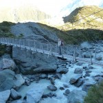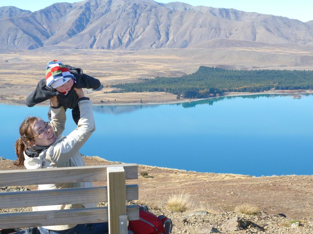 Am Sonntag sind wir dann wie geplant beim Lake Tekapo auf den Berg Mount John gestiegen. Der Aufstieg war recht steil aber hat sich voll gelohnt – siehe Fotos. Nach einem kleinen Mittagsschläfchen (schon schön wenn man einfach auf dem Parkplatz die Vorhänge zuzieht 😉 ) fuhren wir dann Richtung Westen. Eigentlich wollten wir den Mount Cook, bzw das Dorf dazu, erst nicht besuchen, da er in einer 60km langen Sackkasse liegt. Aber man kann dort schön wandern und das Wetter ist nachwievor sonnig und um die 14Grad. Außerdem ist uns aufgefallen, dass wir mit den einzelnen kleinen Ortschaften die sonst so an der Strecke liegen und als sehenswert angepriesen werden, nicht soviel anfangen können. Die ganzen Aktivitäten (Bungee Jumping, Rafting etc) können wir eh nicht machen. Und die Orte sind zwar süß aber meist klein, um diese Jahreszeit sehr ruhig und sie sind sich ähnlich. Nun sind wir also doch zum Mount Cook gefahren und standen die Nacht über mitten im Nationalpark. Zwar auf einem einfachen Campingplatz (mit Selbstregistrierung, ohne Strom aber mit Toiletten) aber nur mit 5 anderen Campern, die über den großen Platz verteilt waren. Dafür hatten wir einen tollen Blick auf die Berge und der Mond schien so stark, dass es richtig hell war. Heute morgen konnten wir dann an den Berggipfeln den Sonnenaufgang verfolgen (Danke Florian, dass du uns soo früh geweckt hast :p ) und sind dann ins Hooker Valley losmarschiert. Florian kommt dann immer in den Tragesack und schaut artig und neugierig nach links oder rechts raus. Der Wanderweg führte über 2 Hängebrücken, die Denise schon einige Überwindung gekostet haben. Aber auch diesmal hat es sich gelohnt, denn hinter der nächsten Kurve erwartete uns die Fototapete mit dem Mount Cook – seht selbst auf den Bildern.