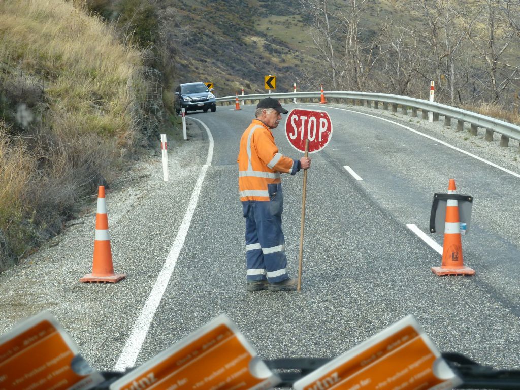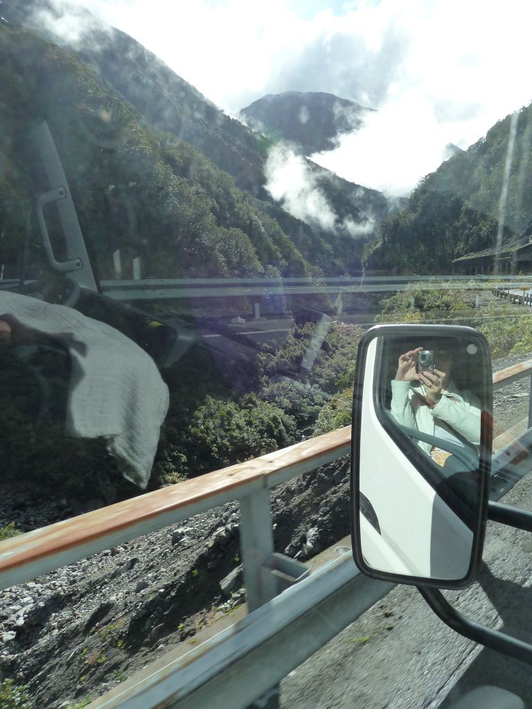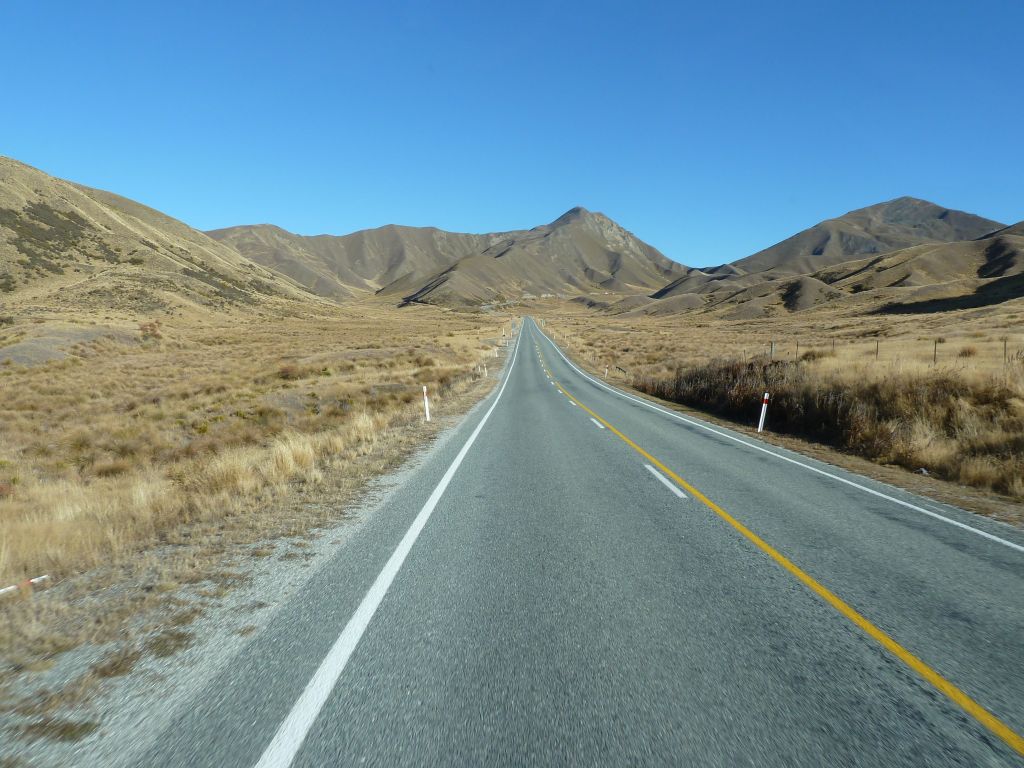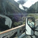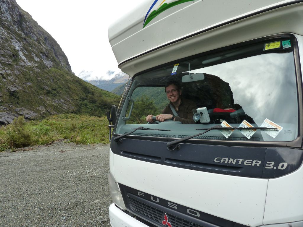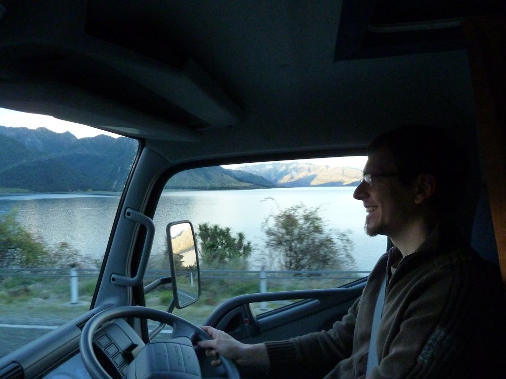 Heute soll es mal um das Fahren auf der linken Seite gehen. Nach nunmehr knapp 2.500km auf Neuseelands Straßen, geht das Fahren auf der linken Seite fast wie im Schlaf. Im Auto selbst ist fast alles verkehrt herum – der Blinker ist rechts, der Scheibenwischer links, dafür die Gangschaltung in der Mitte, aber mit links zu bedienen. Wir haben 5 Gänge und einen Rückwärtsgang. Da wir allerdings im 2. Gang anfahren, haben wir Netto nur 4 Gänge – bei maximal erlaubten 100km/h auch völlig ausreichend. Alles was man im Straßenverkehr wissen muss, steht direkt auf der Straße oder auf den diversen Schildern. Was die Vorfahrt angeht, hat sich erst kürzlich im März etwas geändert, doch gleichberechtigte Straßen sehen wir als Touristen eher seltener 😉 Ansonsten finden alle Verkehrsregeln bei diesem geringen Verkehrsaufkommen sowieso kaum Anwendung. Oft fahren wir viele Kilometer ohne jeglichen Verkehr. Letztens aus dem Milford Sound heraus haben wir 120km kein Auto auf unserer Spur gesehen, nur wenige auf der Gegenspur. Das wichtigste für Mathias als Fahrer ist ansonsten der Rückspiegel am Berg, um als Hindernis die (seltenen) Fahrzeuge hinter uns passieren zu lassen – nicht das hinten jemand am Steuer einschläft 😉 Aber auch dafür ist hier gesorgt – es gibt hin und wieder „Passing Lanes“ oder „Passing Bays“ an den Steigungen. Breit genug sind die Straßen auch für unser großes Wohnmobil, nur bei den Brücken wird es hin-und-wieder eng: viele Brücken sind nur „One Lane Bridges“, also einspurige Brücken, welche mit einem Vorfahrtsschild ausgestattet sind und dann heißt es Augen auf. Die längste einspurige Brücke Neuseelands haben wir in Haast überfahren: ca. 960m – hier gab es allerdings zwei Ausweichstellen, welche wir ohne Gegenverkehr natürlich nicht brauchten. Auch bei den Kurven haben die Kiwis gespart. In der Nähe von Christchurch fuhren wir eine Straße 20km gerade aus – ohne Kurve! Hier im Westen an der Küste geht es dagegen meist Serpentinen-mäßig voran.