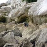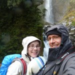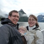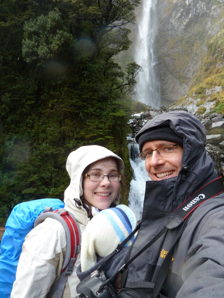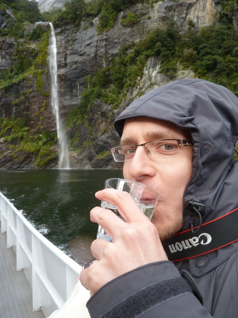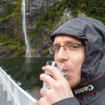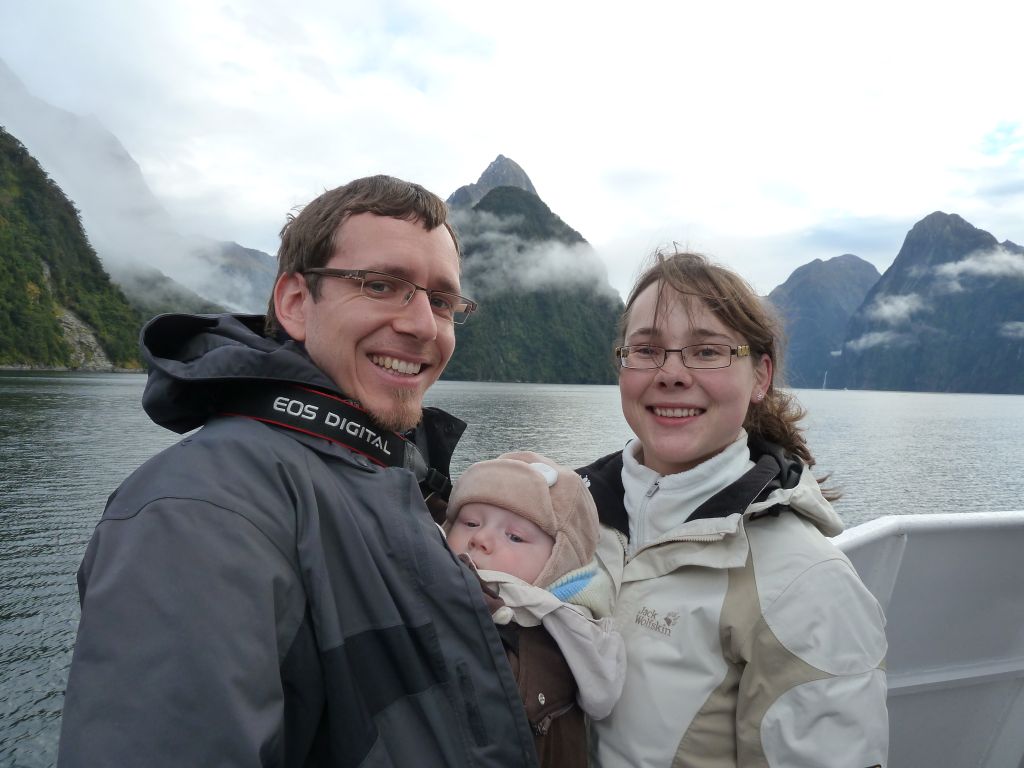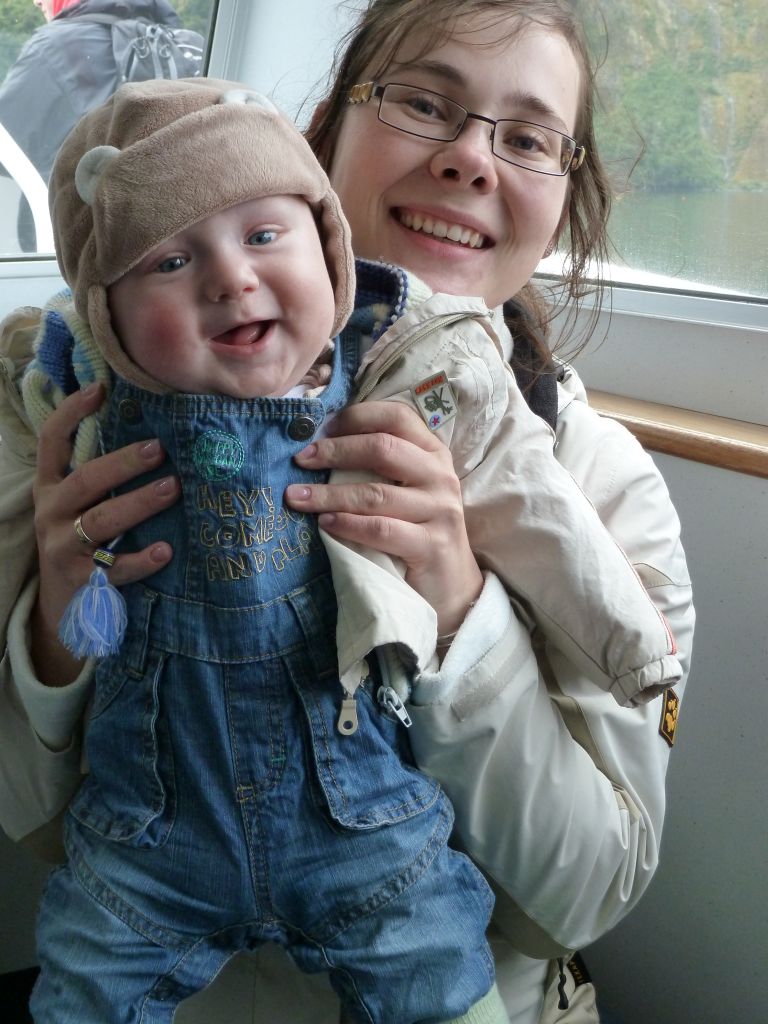 Wie nicht anders zu erwarten verlief die Nacht ereignislos und wir wurden vom gestellten Wecker um 6:30Uhr geweckt, damit wir vor den ganzen Reisebussen am Milford Sound ankommen. Das letzte Stück dorthin führte u.a. auch durch einen 1 km langen Bergtunnel, der nur spärlich beleuchtet und dessen Wände noch aus dem rohen Granit bestehen – es fühlt sich an wie durch ein Bergwerk zu fahren. Obwohl es immernoch nieselte, entschieden wir uns für eine Bootstour durch den Fjord. Und diese Entscheidung war goldrichtig. Zum Einen hörte es auf zu regnen sobald wir losfuhren und zum anderen hatten wir tolle Ausblicke auf die Berge und die Wasserfälle. Denn durch den Regen kamen erst viele der Wasserfälle wieder zum Vorschein. Hier ist ja Herbst und daher ist die Gletscherschmelze schon lange vorbei. Der Kapitän des Ausflugsbootes fuhr dann auch 2 mal so nah an die Wasserfälle heran, dass das Wasser aufs Deck klatschte. Beim ersten Mal ließen sie dabei Gläser mit dem Wasserfallwasser füllen und wir durften dann von dem kühlen reinen Nass probieren – Prost! Außerdem hatten wir Glück und sahen auch 2 Robben 🙂 Florian machte wie immer super im Tragesack mit.