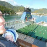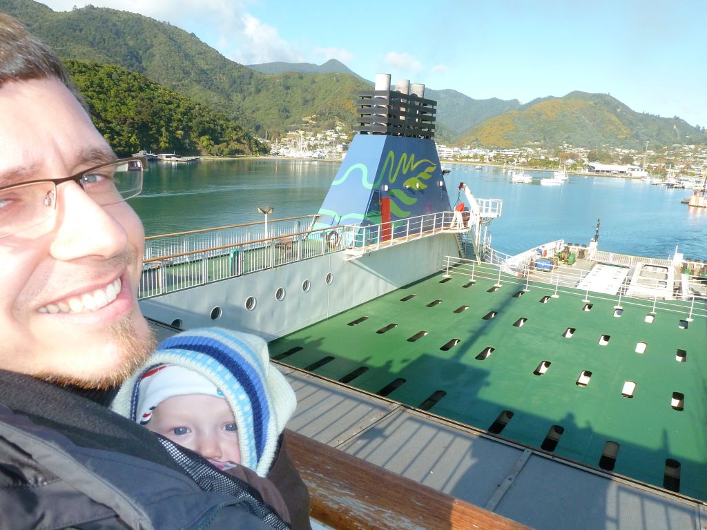 Wie geplant sind wir am Donnerstag von Nelson nach Picton gefahren. Auf dem Weg dorthin haben wir in Havelock die dort üblichen greenslip mussels (Muscheln) gegessen. Die gab‘s mit 6 verschiedenen Soßen und waren super lecker. Gut gestärkt ging es dann über den kurvigen Queen Charlotte drive immer entlang dem Fjord. Da es in jeder Kurve schöne Ausblicke gab, brauchten wir für die 30km ewig 😉 Picton selbst war dann – wie so viele andere – eine kleine ruhige Ortschaft. Unsere Fähre sollte am Freitag um 13Uhr abfahren und da man rechtzeitig einchecken sollte, waren wir so pünktlich dort, dass wir sogar gerade noch so auf die vorherige Fähre durften. Dort standen wir dann neben vielen anderen PKWs, erstaunlich wenigen Wohnmobilen aber auch Lastern mit Kühen und Containern. Die 3 stündige Fahrt durch den Fjord, über den Cook Strait und dann in die Bucht von Wellington, war landschaftlich schön anzusehen. Leider wurde es immer windiger, je weiter wir aufs Meer raus kamen und so konnten wir nicht im Freien bleiben. Florian spielte dann auf einer der Sitzecken. Denise war ein wenig seekrank, als das Schiff dann über die größeren Wellen schaukelte. In Wellington angekommen, suchten wir erstmal einen Parkplatz in der Innenstadt – was mit unserem kleinen LKW gar nicht so leicht war. Dann war endlich einer für 4 Dollar die Stunde gefunden und wir spazierten zur i-site (der Touristeninformation) und dann zum CableCar. Das ist eine alte kleine Zugbahn die über 4 Stationen einen Hügel mit schönem Ausblick hochfährt. Zurück liefen wir den Hügel hinunter und konnten einmal miterleben wie schnell sich das Wetter in Neuseeland ändert. Unten auf dem Parkplatz war es noch sonnig bei gefühlten 18Grad, eine halbe Stunde später auf dem Hügel war es kühl, windig und kurz vorm Regnen. Dank unseres Eiltempos waren wir dann auch genau zu den ersten Tropfen wieder im Campervan – und erleichtert diesem Gewusel und der Hektik wieder entkommen zu können. Wir haben uns in den letzten Wochen schon so an die weitläufige Natur ohne Menschen und den wenigen Verkehr gewöhnt, dass wir erstmal nur wieder zurück in unser kleines mobiles Zuhause wollten 😉 Heute sind wir nun schon 200km nördlich von Wellington aber es ist immer noch viel mehr besiedelt als der Süden und wir haben schon ein bisschen „Südinselweh“. Aber es gibt auch gute Seiten – da man hier flächendeckend guten Handyempfang hat und auch die freien Stellplätze nicht weit von Zivilisation sind, haben wir gleich ohne ein mulmiges Gefühl die erste Nacht an einer Bucht frei gecampt. Dafür stehen wir heute aber auf dem bisher teuersten Campingplatz :/
